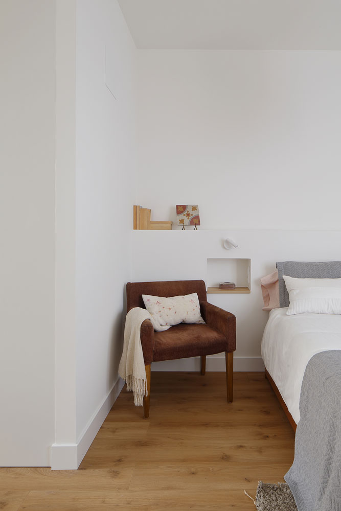 Se decide reorganizar los espacios y abrir una gran zona de día, en la que la cocina, el comedor y el salón formen una única y luminosa estancia, orientada hacia la calle Caveda. De este modo, se consigue que toda la zona de noche quede orientada hacia la fachada trasera, hacia el patio de manzana, quedando más privada y aislada del ruido del tráfico. No obstante, el aislamiento al ruido de toda la vivienda se garantiza con la sustitución de todas las carpinterías exteriores por otras de grandes prestaciones térmicas y acústicas, cumpliendo al mismo tiempo con la normativa de protección de la fachada del edificio en lo que respecta a colores y composición.